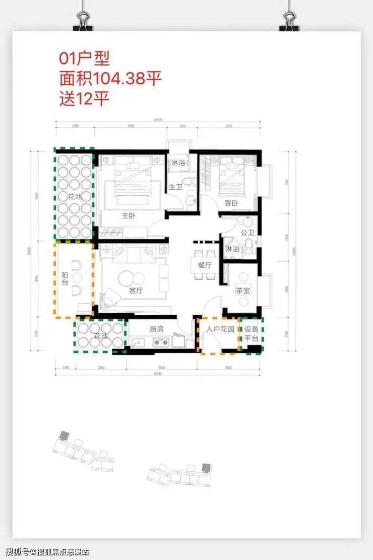 1号房,3房2卫:约104平送12平(总价403-467万)
