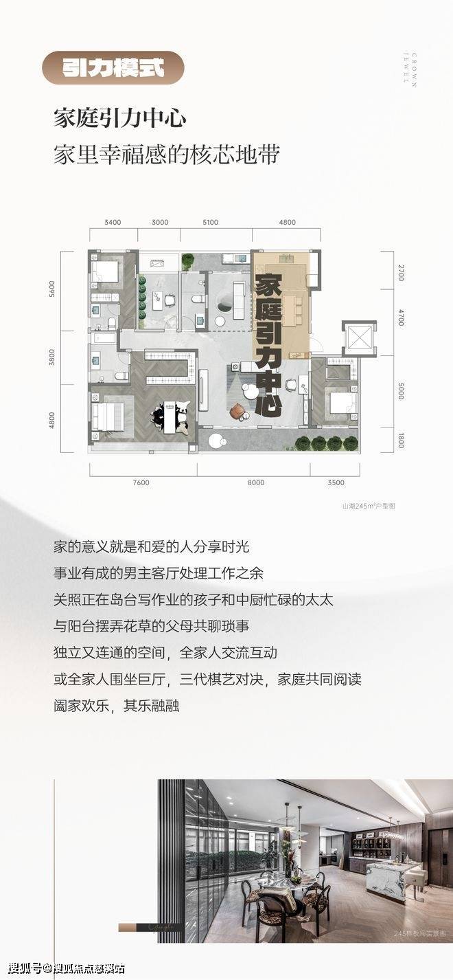 山湖245将空间魔法迭代,公区更新升级,创新“约100㎡LDKB至尊空间”——即“景观阳台-客餐厅-社交化厨房+岛台”组合为中心而展开的关系场,约占比整个户型空间的41%,将家庭的主要生活场景和主人的社交场景都放到了这约100 ㎡的空间里。
