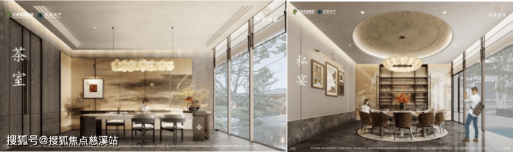 整个庭院被叠水包围,水流层层跌落,周边布置了浮动的绿岛与形态各异的景石,形成山水效果。金属连梁环绕整个水景,而在水景之上斜置两座景亭。会所区域与景亭相对,整体空间尺度带来的视觉冲击十分强悍,内部配置了健身房与私宴厅,未来销售功能完毕后,可以装载更多功能,在区域市场,绝对是遥遥领先的配置。