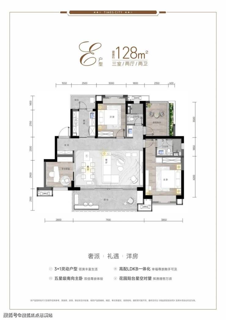 洋房 128 ㎡:四房两厅三卫,横厅+270° 观景阳台