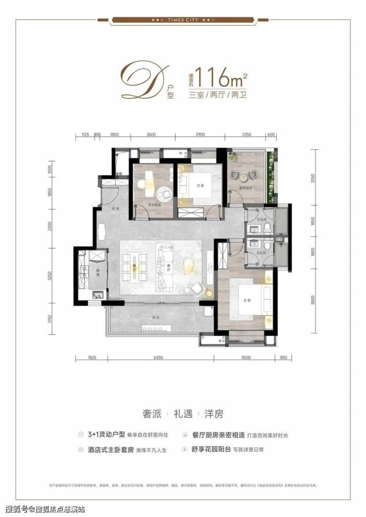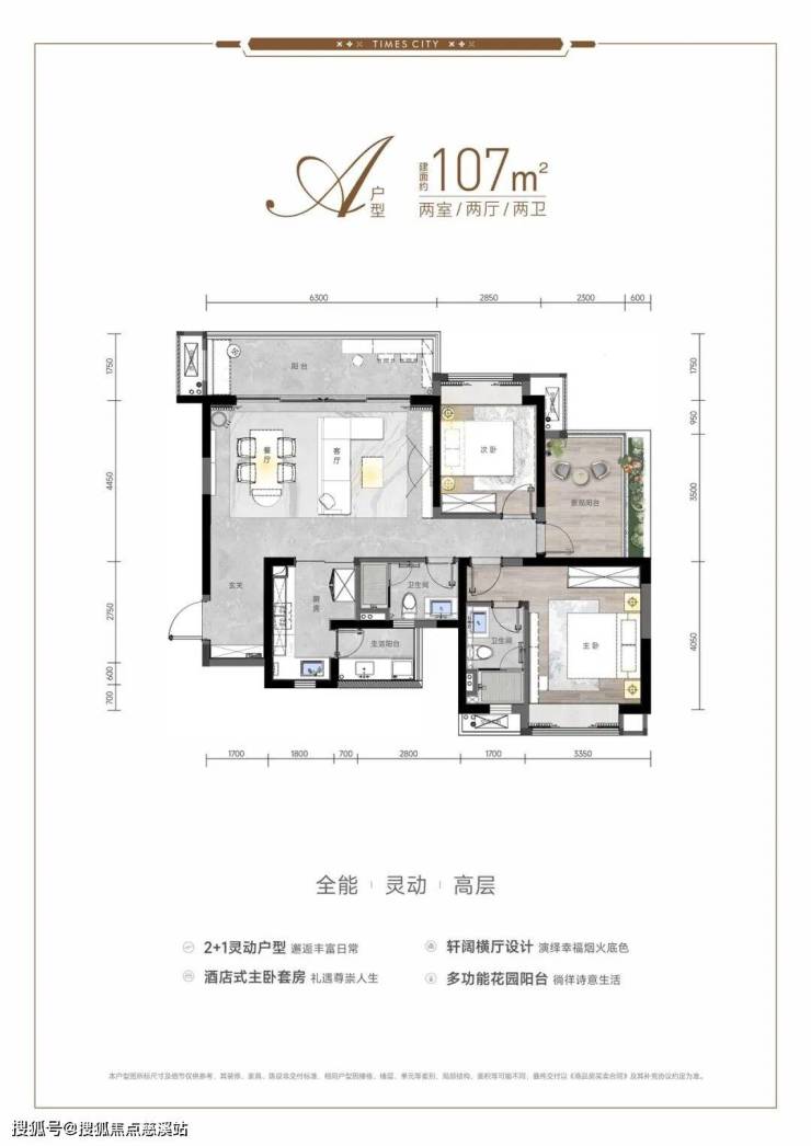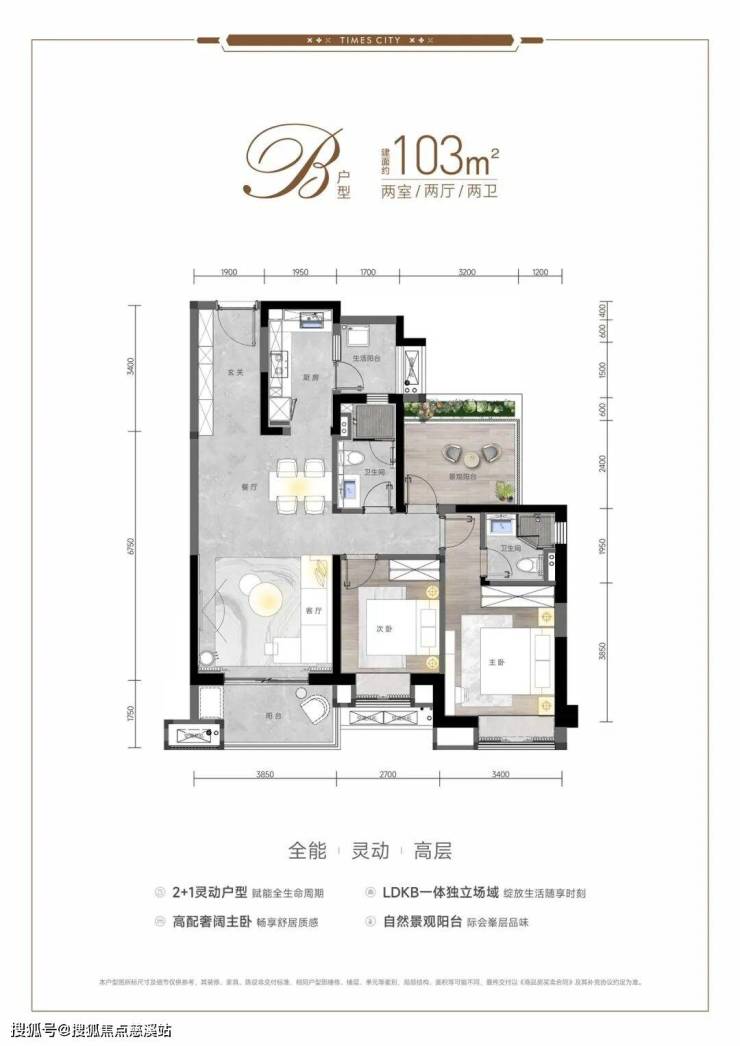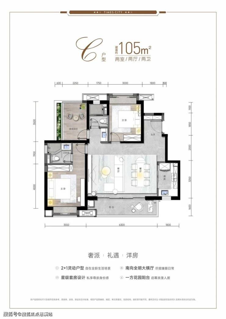 洋房 103 ㎡:三房两厅两卫,横厅+6.5 m 阳台