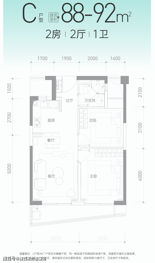 C/C''户(88-92㎡2居,主卧3.6m)。