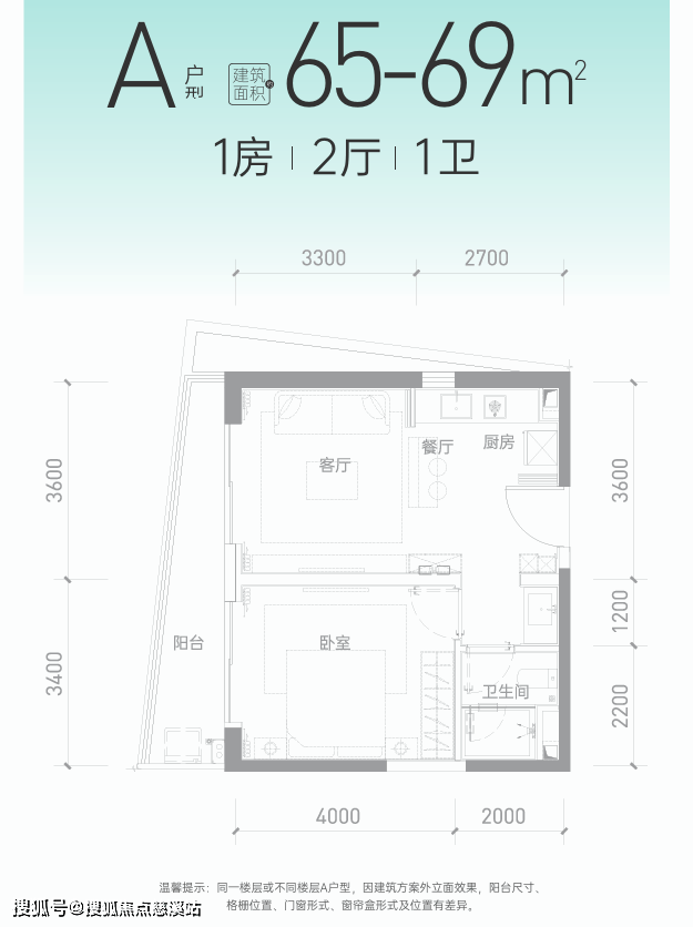 A户(65-69㎡1居,餐阳3.6m);