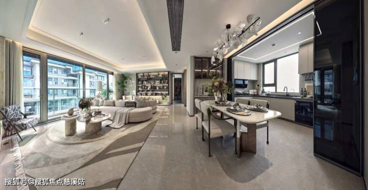南向景观面做到惊人的约13.6米,客餐厨空间与阳台无界交融,在这里,可以轻松举办宴会、沙龙社交
