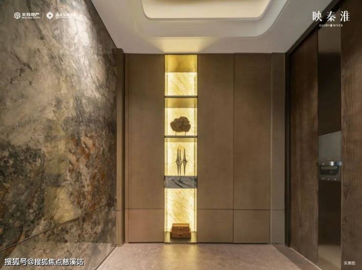 顶部是定制化的造型立体铝板,对景景墙是百万级的马达加斯加矿源的蓝翡翠奢石,穹顶下方是安哥拉黑液态大理石,中间是宝格丽酒店同款环岛落客区,营造了气势撼人的归家尊崇仪式感。