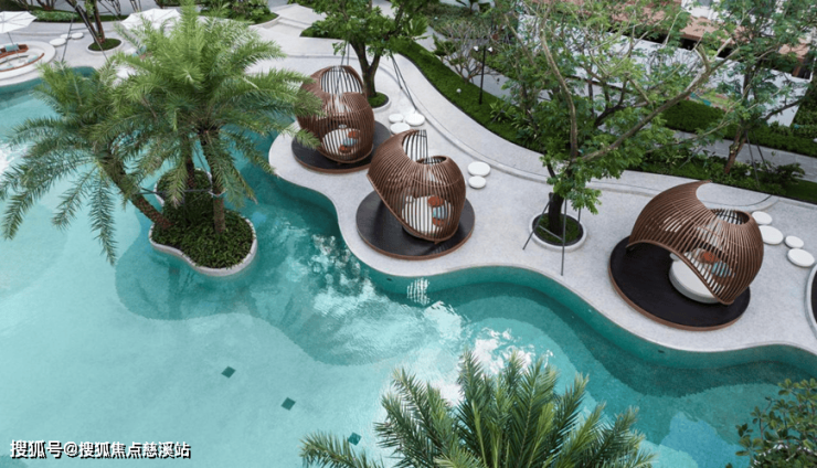 洋房区以泳池为核心进行功能展开,自然流动的曲线,放松的海岛布置,风情的凉亭餐吧,多样的场景体验,都在创造具有独特在地符号和场所记忆的艺术空间,紧密围绕这些开展社区的水上活动,泳池派对,同时又是一种热带海岛的度假体验。