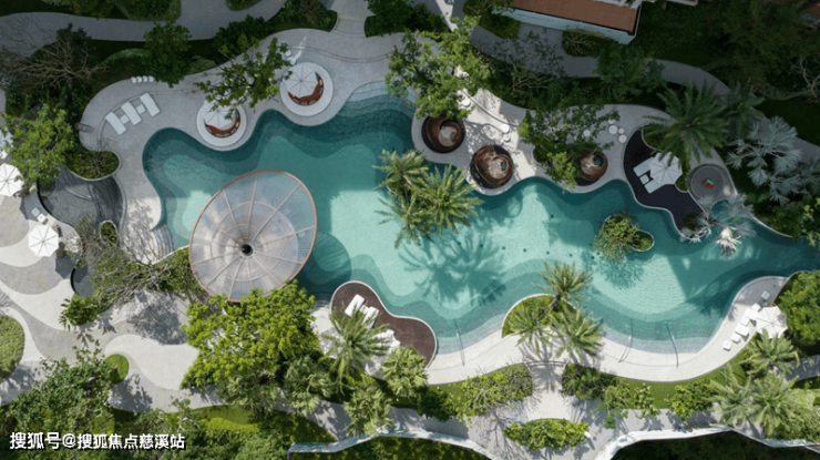 泳池律动的线条灵感源于自由流动的海水冲刷,形成海洋中丰富的肌理,漂浮的绿岛穿插其中,来到这里仿佛置身于海岛森林里,在海天一色的蓝色秘境中,享受椰林海风、斜阳霞光,海风呢喃。
