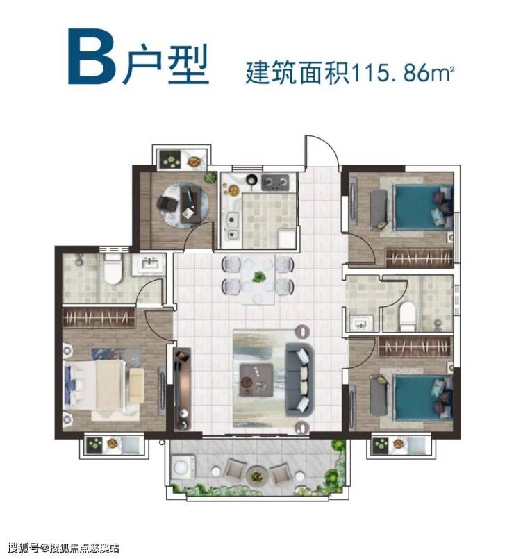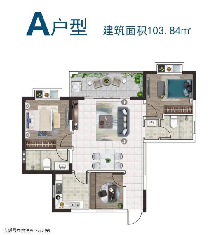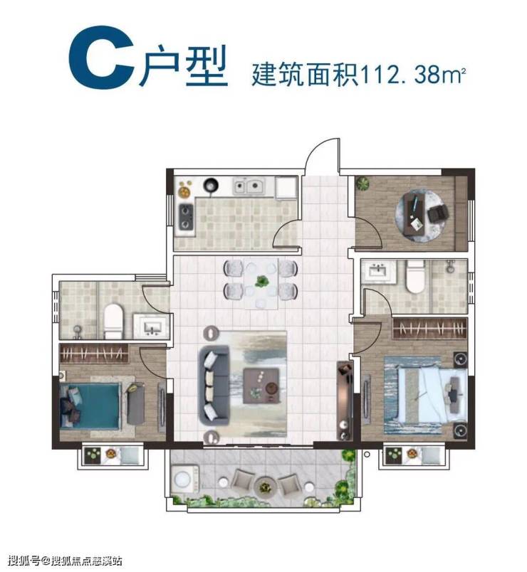 户型分为A型103.84㎡、B型115.86㎡、C型112.38㎡,三种户型。