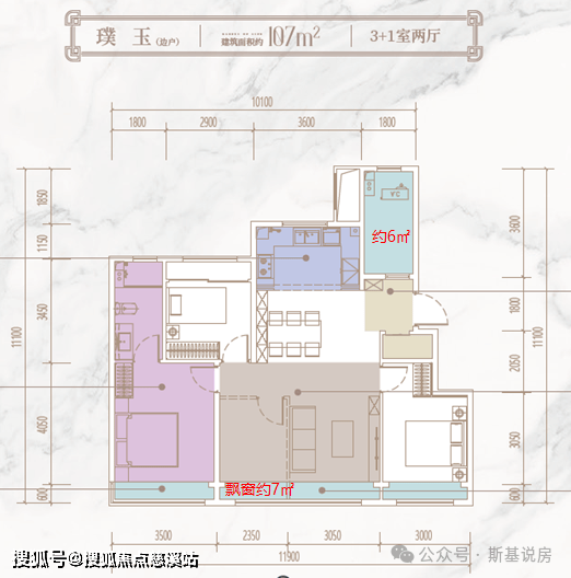107㎡ 的户型,客厅5.4米开间,改成3+1小其实还是略有局促,5.4米不太适合。进门玄关有额外的收纳空间,上面92㎡的户型也会在玄关处有个小储藏间。