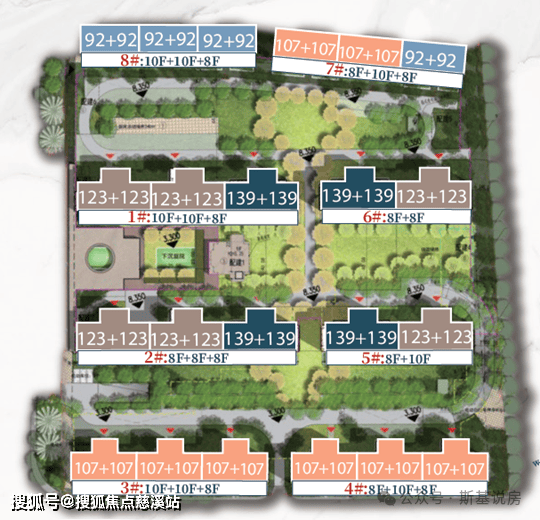 最小户型92㎡,和107㎡排布在南北两排临路位置,中间区域是123㎡,以及社区中心的139㎡。