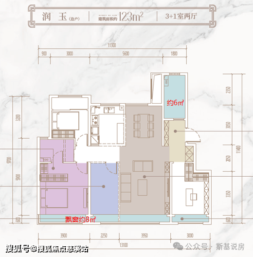 123㎡的户型,客厅开间6.4米,把一定面积给到了主卧套,主卧开间3.9米,这个尺度还是比较大的,一般都是做到3.5米左右。这几个户型都是南北飘窗赠送,一般是在北卧。