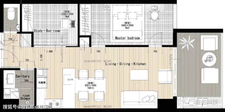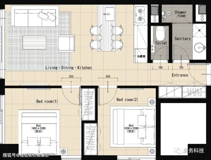 B户型 建筑面积70-75㎡ 2房2厅1厨1卫