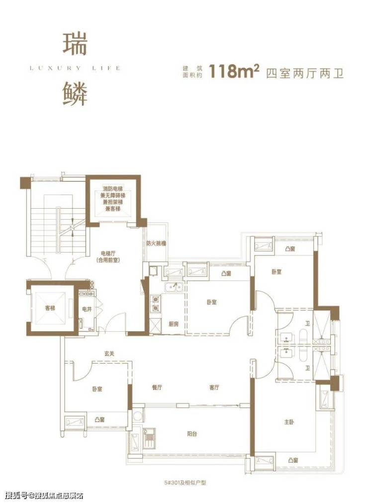 建面约118㎡户型(5#301及相似户型),则以更为精巧的尺度,实现了四室两厅两卫的全能格局,堪称“友好轻奢”理念的浓缩典范。其核心在于打造了一个LDKB一体化家庭厅,让客厅、餐厅、厨房与阳台流畅贯通,形成高效互动、情感充盈的家庭核心区。