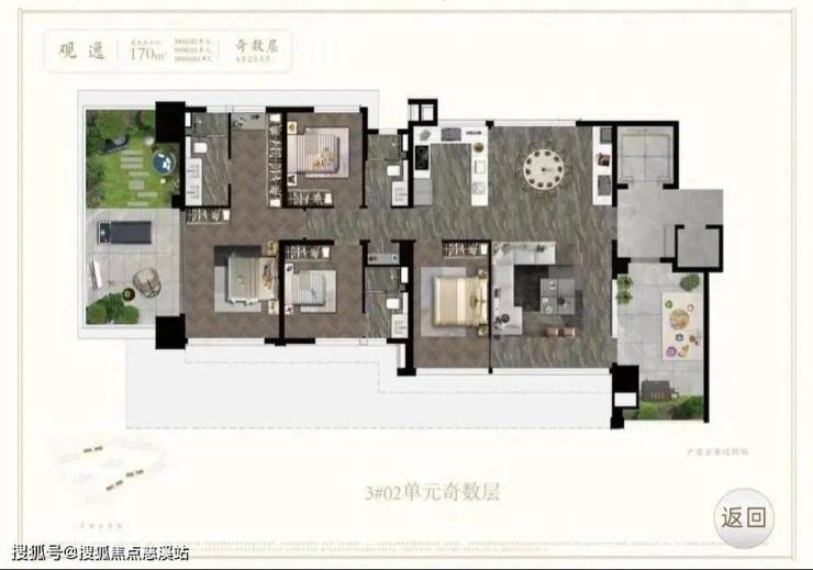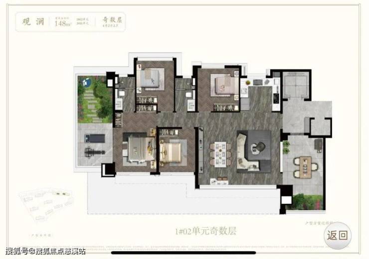 四房两厅三卫,两梯两户,四开间朝南,设有独立客餐厅,南北通透。在空间布局上,主卧宽敞舒适,占据核心区域。奇偶层布局一致,区别在于南向分别拥有宽敞的长条形庭院或分割式庭院。就此面积段来说,客厅宽度如果可以再做足一点就更好了。