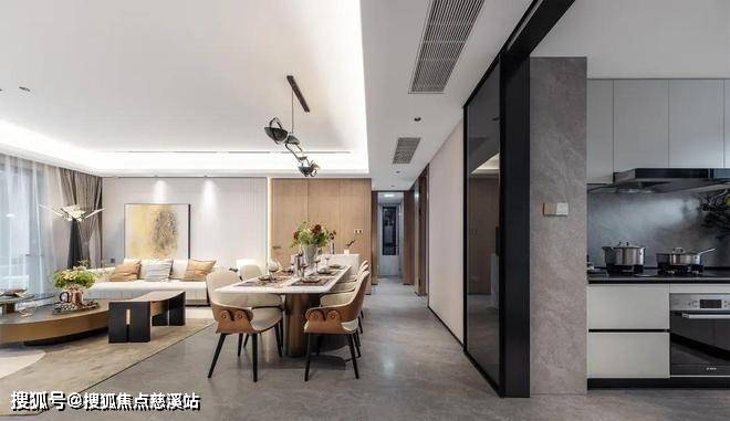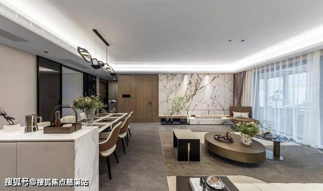 大块水波纹岩板搭配大面格栅木饰面+地面为深色系地砖通铺+全屋整体暖色系用色+主卧皮革软包背景墙等等,多个场景尽显赏心悦目的美感~