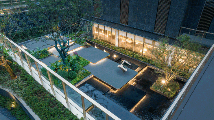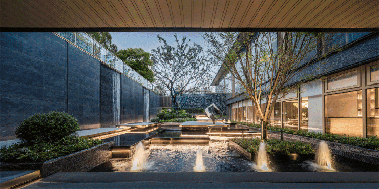 寓意深远的青云五阶、意趣纵横的四水归堂、写满自然之趣的山水景墙,独特光影的镂空叠水,巨石、飞瀑、小桥、流水、果岭丘地等一一缤纷呈现,太养眼了!