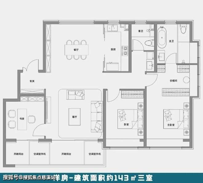 143㎡这个户型,虽然没有做大宽厅,但客厅开间也在4.6米左右,三室都在南向,采光上比较适合北方购房者。