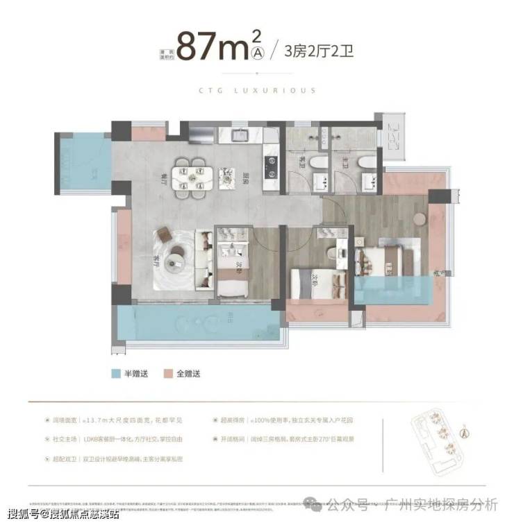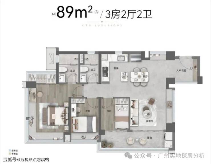 89方三房两厅两卫,百分百使用率,270度飘窗5.9米大阳台。