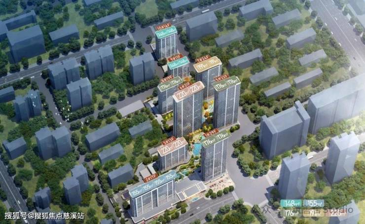 楼栋分布,锯齿状地块不规则,在中南部位置凹出地下会所和景观水池前设置两栋220㎡的户型,148-155㎡的小高设置在两端,南侧沿路也有一栋176㎡大户型。