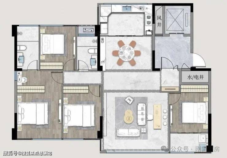 128平:四房两厅两卫,独梯产品,四开间朝南,比较主流的布局,缺点就是餐厅空间略局促,厨房在北侧,并非完全南北通透,客厅包阳台,成方厅,相比于宽厅效果差一些。
