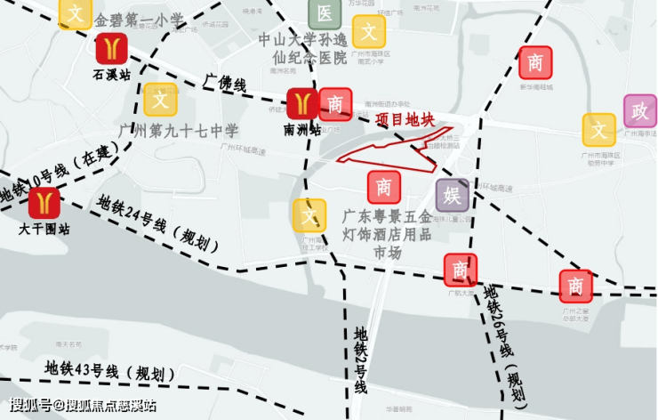 项目地块距离2号线和广佛线交汇的南洲站直线距离仅约500米,广州绕城高速和广州大道在项目旁交汇,位置可以说是“四通八达”,
