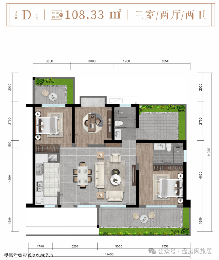 D户型:约108㎡全景三房房两厅两卫,三阳台臻稀户型,艺术空间组合序列,人性化精析设计,纵享更多起居空间
