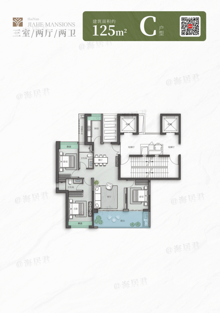 再来看建面约 125㎡的C户型,经典的三房两厅两卫设计,户型采用“三叶草”的布局,三个卧室分散在三个角落,互不打扰。