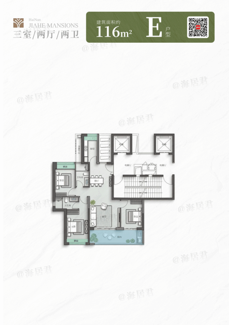 还有建面约 116㎡的E户型,同样是三房两厅两卫的格局,餐客厅一体化设计,客厅连接约6.6米的景观阳台,空间更显开阔从容。