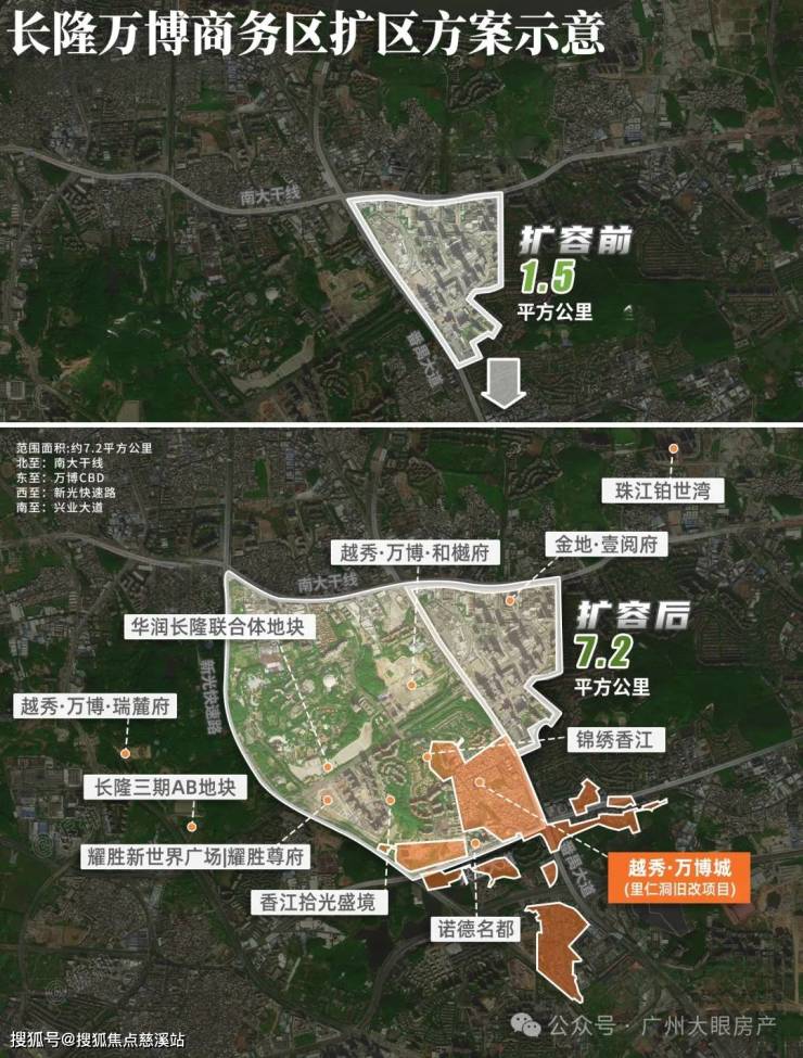 2023年4月,万博官宣扩容,占地面积由1.5平方公里延展至7.2平方公里,覆盖长隆、里仁洞片区,规模甚至超越6万平方公里的珠江新城,剑指世界级地标商圈。