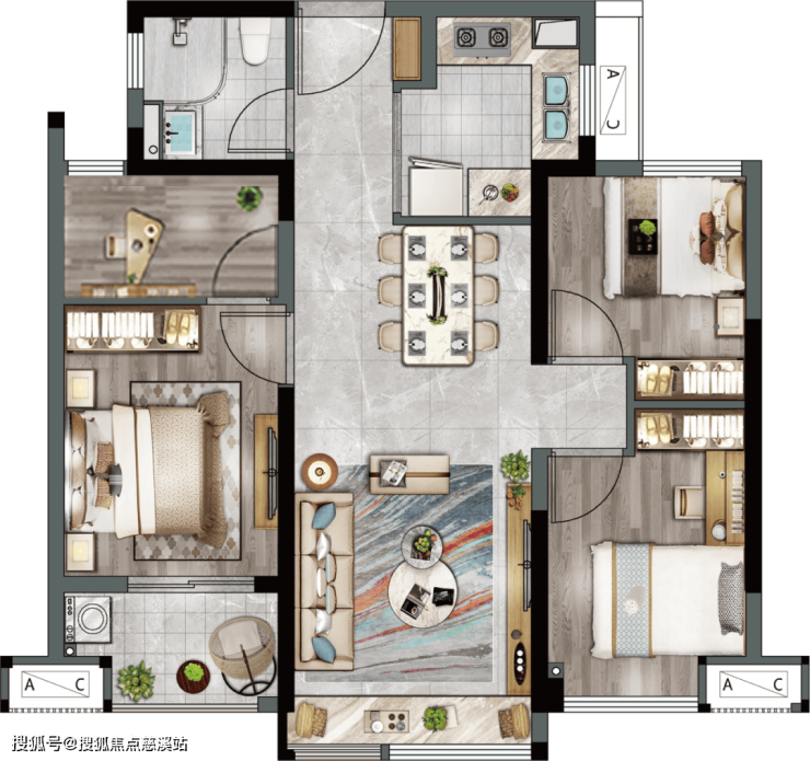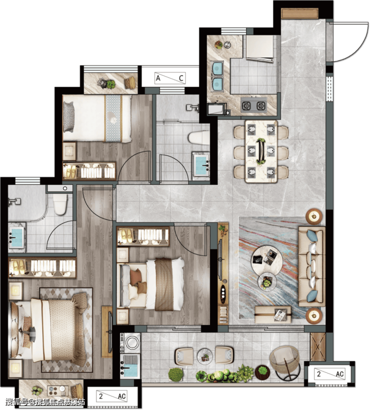 实用三居,实现家庭共享天伦之乐;餐客厅一体设计,满足宴客空间的需求。