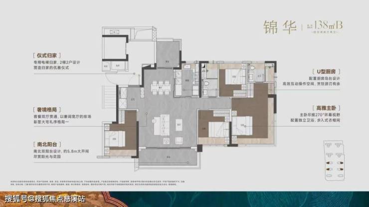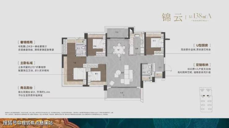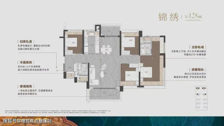 建面约128㎡户型同样是四房布局,南北双阳台,一体化独立餐客厅,连接阳台形成大聚厅,适合聚会用。