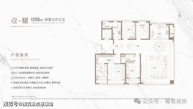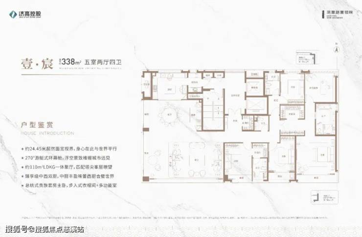 楼王户型:336-350㎡大平层(8#、12#楼王),首层层高3.5米,标准层3.3米,配备环幕端厅及独立家政间。