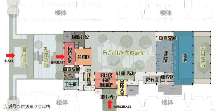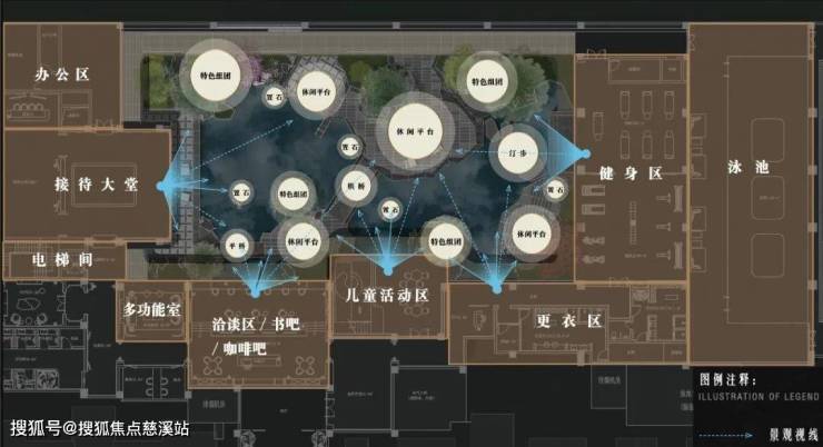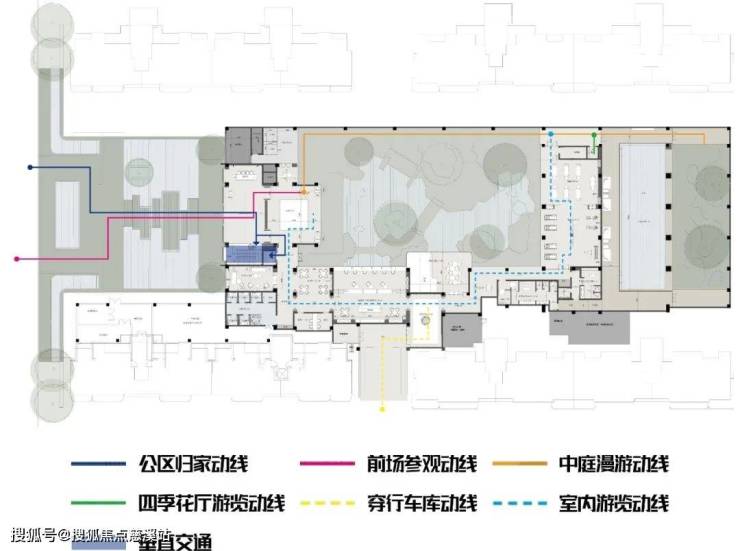 酒店式归家入口→礼序前厅→社区归家大堂→东方山水疗愈后庭→带泳池的业主会所→天井庭院→四季花厅。