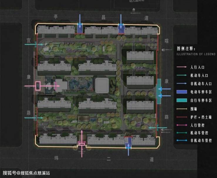 专供人行的主、次入口分别朝向西、南,三个车行入口设于东、西,互相之间保持相当距离,避免动线干扰。