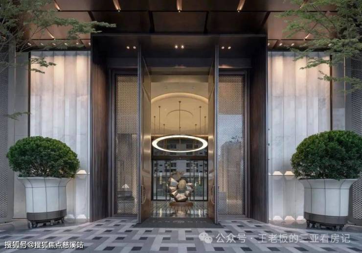 踏入三亚保利天珺主庭,玉的仪式感自门庭启幕——约3.6米高海浪灰石门柱顶悬精致玉石,珺字徽章如玺印烙刻山河气度。