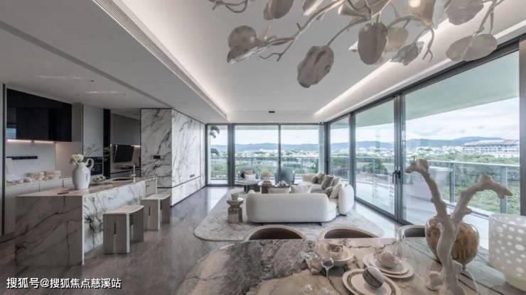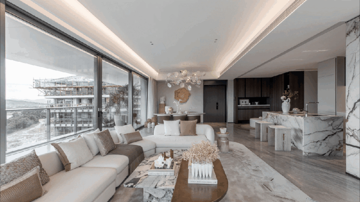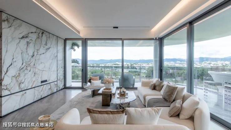 在建筑风格上,以“海洋灵动曲线”为设计语言,从海洋动态中汲取灵感,通过铝板与玻璃所呈现的横向柔美线条,打破固有审美,让建筑呈现出“云上花园之居,水上漂浮之所”的海洋灵动感。