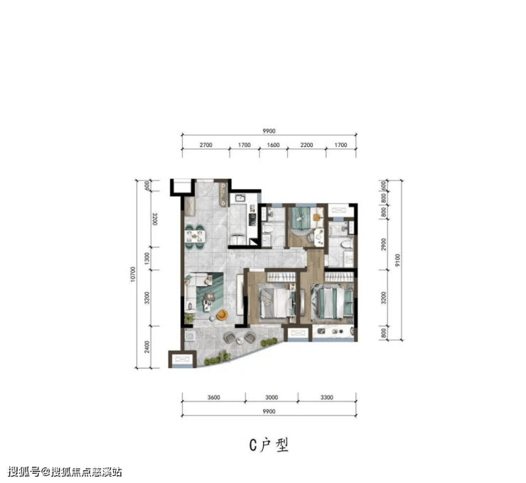 ▼“C”户型图约95㎡三室两厅两卫▼