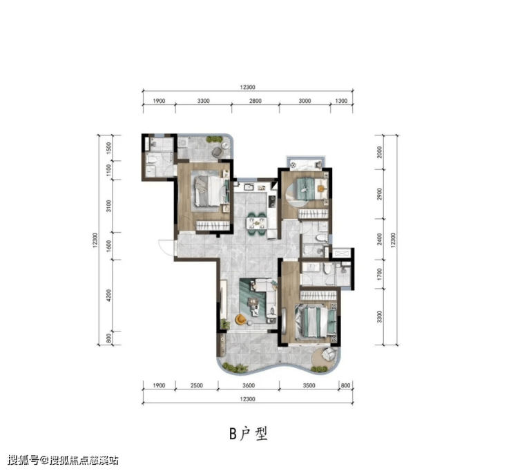 ▼“B”户型图约118㎡三室两厅三卫▼