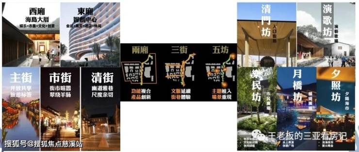 项目以崖城明清历史为主题,依托城市文化底蕴及特色合院设置,将古代崖城街景复制,延续崖城两千年古村文脉,植入文化体验,打造两厢、三街、五坊,营造小镇的历史体验与文化创意。
