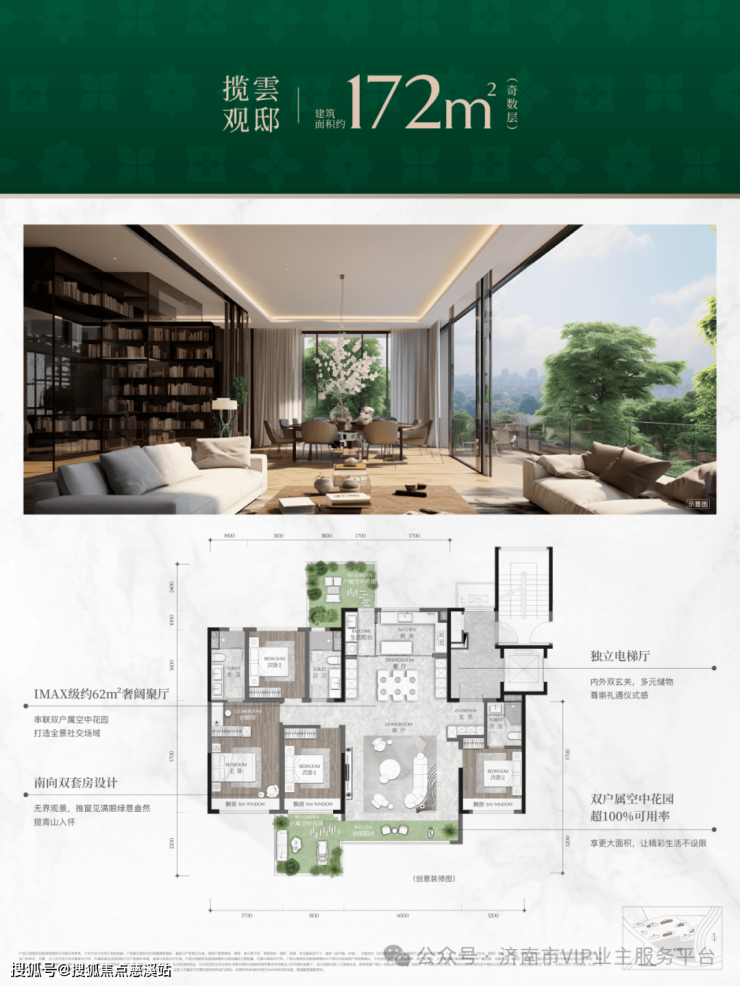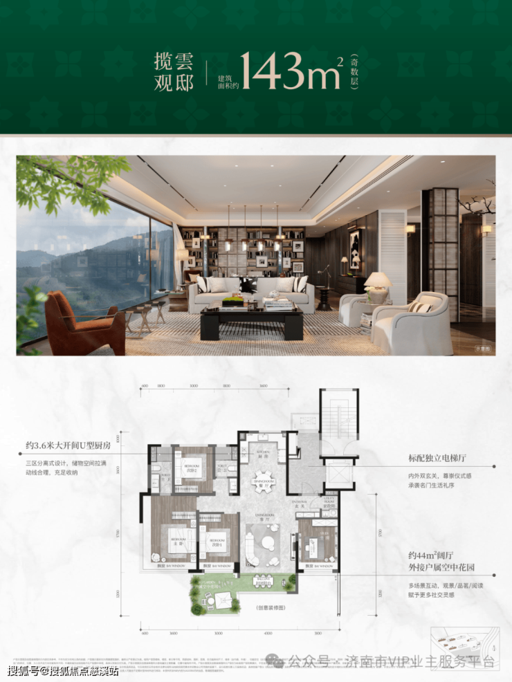 ◉ 270°全景户属庭院:济南首个270°全景户属露台式庭院,轻松实现一户一景,宽阔的全景视野,户属露台式庭院与客餐厨空间形成互动洄游,定制观山视角难以复制,从容进阶山居品质改善。
