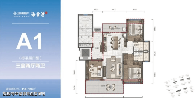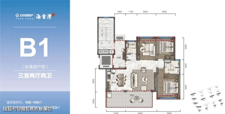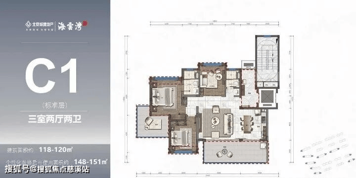 标准洋房产品(B1、C1):主力107-120㎡超大横厅宽境墅质洋房 三室两厅奢适尺度阔景阳台,纵览一线海岸