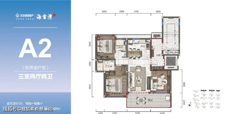 A2户型特点:南北赏望山林海河,妙趣天成艺术花池连廊皆为风景,归家之旅步步生趣三大开间朝南吸纳光彩,明朗通透6.8米双联阳台捕捉舒心与惬意,饱览胜景舒适餐厨客厅全开设计,乐享家庭温馨时光