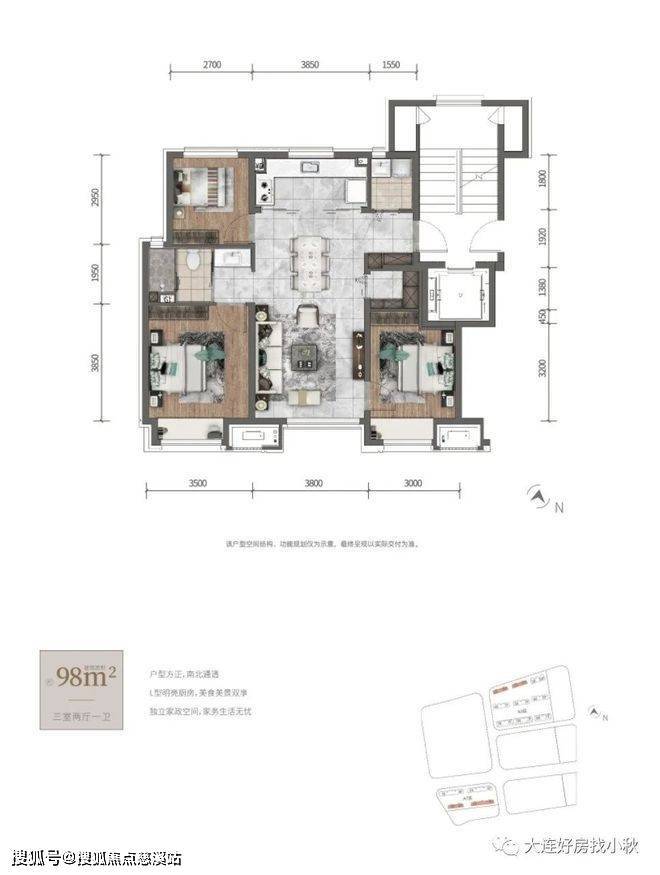 高层34层顶,85平(70%得房率)