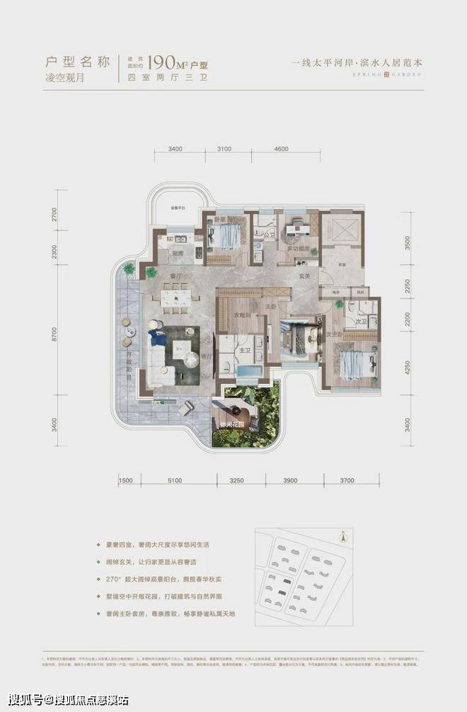 项目在空间布局上追求极致的舒适与实用。建面约115-190㎡的谧境山水大宅,不仅南北通透、全明格局,更配备了约6.2米的生态立体花园和连通270°观景的开敞式阳台,让居民在家中即可畅享阳光与清风,满足对诗与远方的无限想象。同时,项目还设计了约4.2米的全龄主题架空层,为业主营造丰富的生活场景新体验。