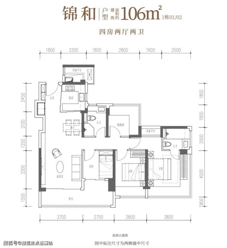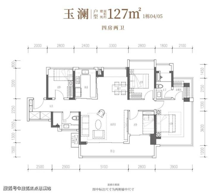 双龙抱珠设计,客厅面宽3.7米,四开间朝南,主卧和两个次卧有转角飘窗。得房率约104.06%(含赠送),客厅连接约11.76㎡超大阳台,朝向东北。