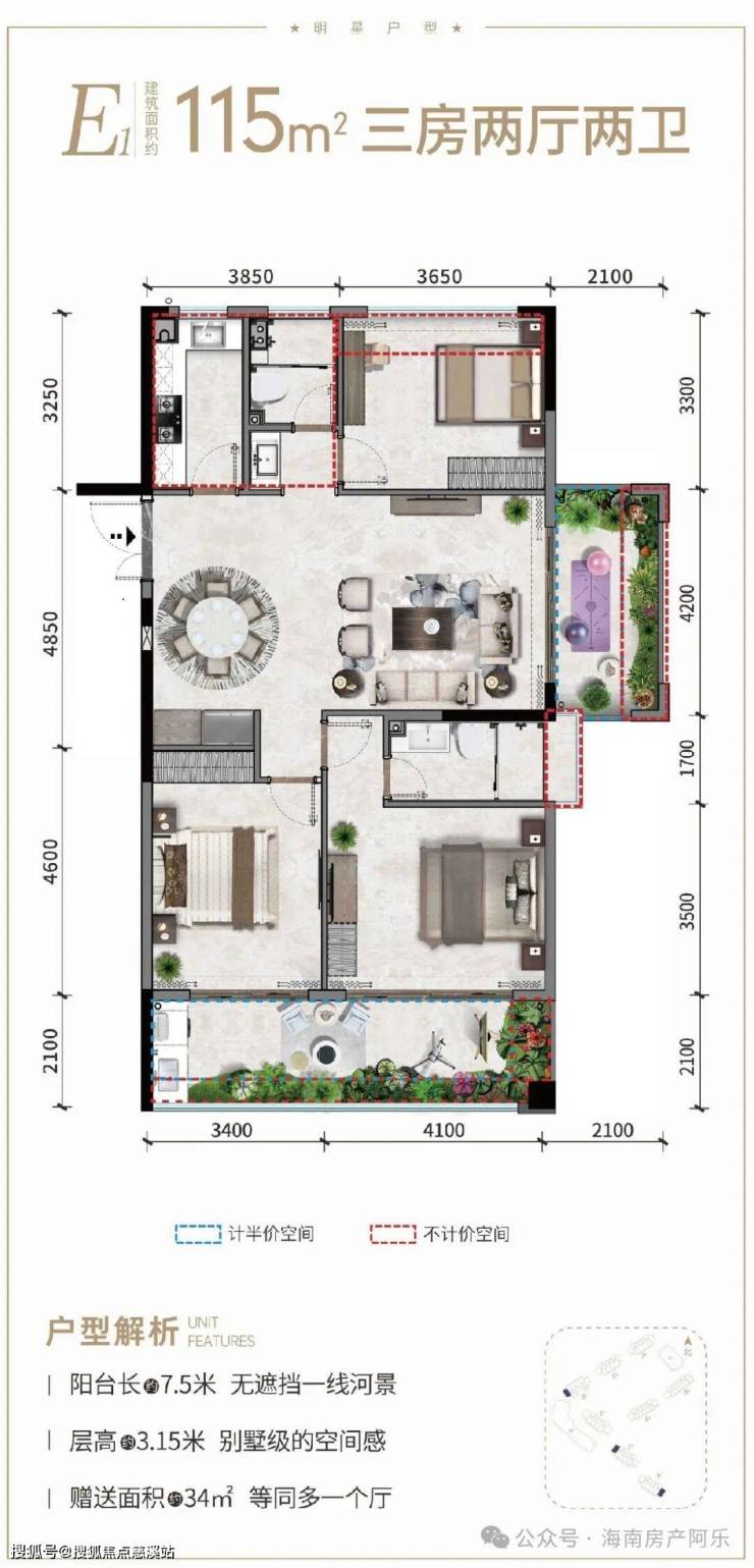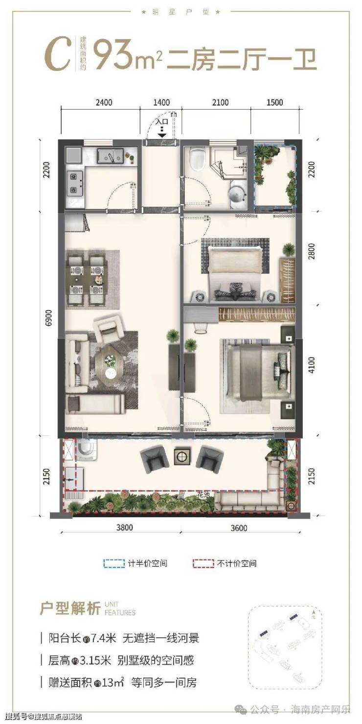 ②产权式酒店,户型南北通透,面积93-145㎡两房至四房。赠送超大面积,93㎡两房一卫、97㎡小三房两卫、115㎡三房两卫、141㎡四房三卫;阳台面宽高达12米,部分阳台可270°三面河景。