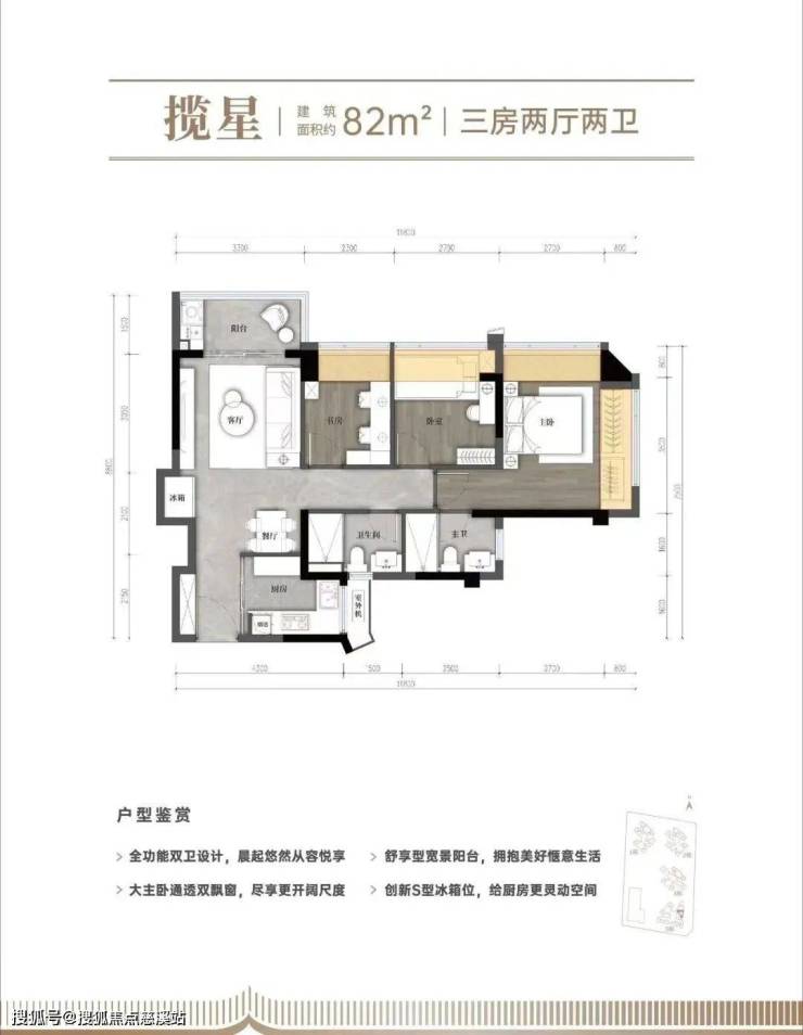 【建面约82㎡的三房两厅两卫】:竖厅三房,动静分区,S型冰箱位,阳台空间比较大,有差不多4.9个平方,主卧双飘窗,带独立卫生间;房间都很通透,采光也好,因为都带飘窗。