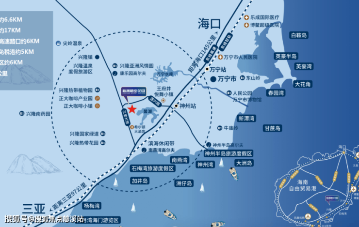 飞机场:距离博鳌机场约62公里、三亚机场约97公里,海口机场约145公里;