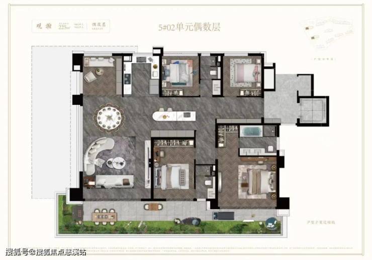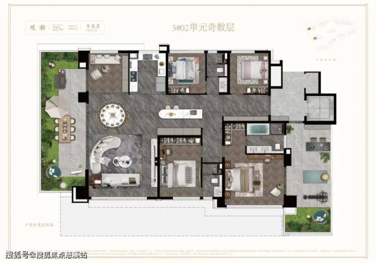 220平米:五房两厅三卫,2T2,布局有所改变,采取了大平层常用的侧边客餐厅,做到L的转角采光,搭配左侧和南侧的内河,有一定景观,主卧同样占据较大面积。