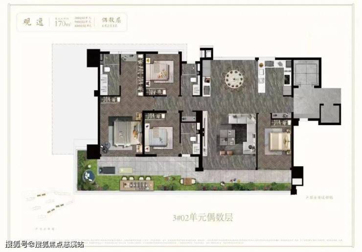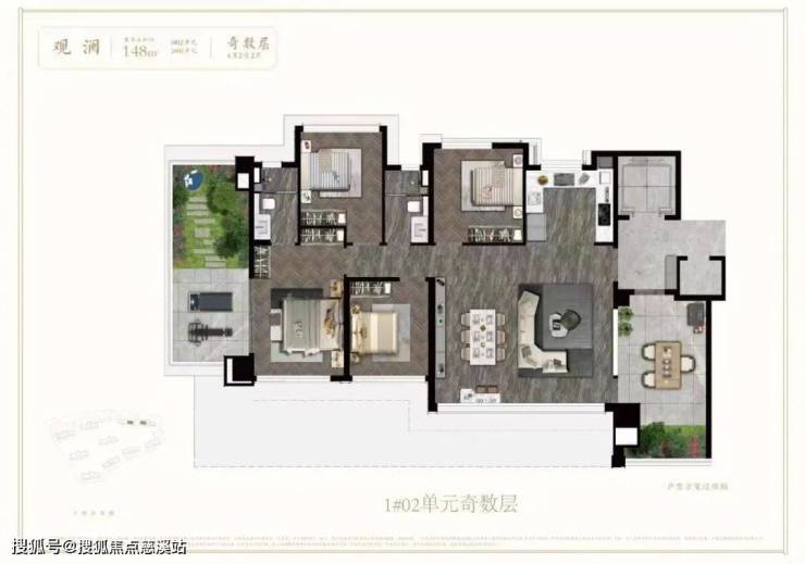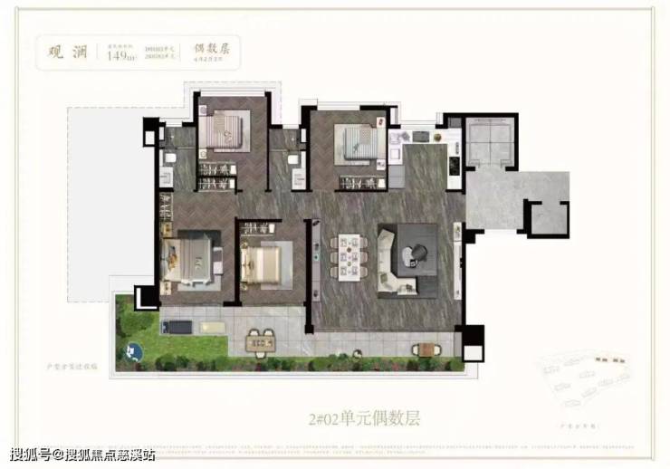 149平:四房两厅两卫,2T2,大面宽布局,客餐厅一体化设计,空间感更强,对于第四代的前庭后院,项目的偶数层采取南向的长阳台,独享,奇数层采取分隔,主卧搭配侧边阳台以及一个中间庭院。
